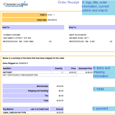 Contents: The order receipt consists of the following areas, highlighted in the image below: