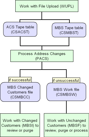 The system checks the ACS Tape table or the MBS Tape table, depending on your entry in the Input file type field at the Process Address Changes Screen (PACS), and uses this information to populate the MBS Work table. |