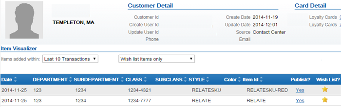 Wish List A separate row displays on this screen for each individual item/SKU on the customer’s wish list that matches an item/SKU in Order Management System. |