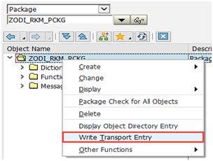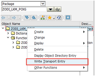パッケージ名を右クリックして、「Write Transport Entry」をクリックします。