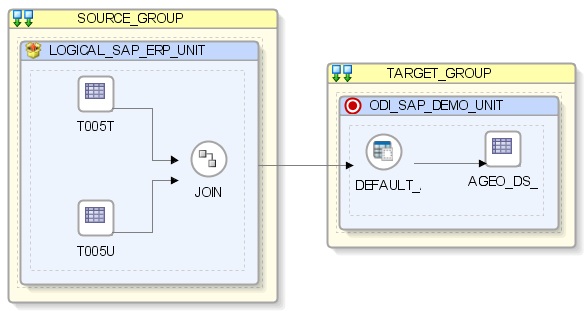 ソースおよびターゲットのデータ・モデルが作成された結果、T005TおよびT005U SAP表からWS_GEO_DS Oracle表にデータを統合するマッピングを作成できるようになりました。