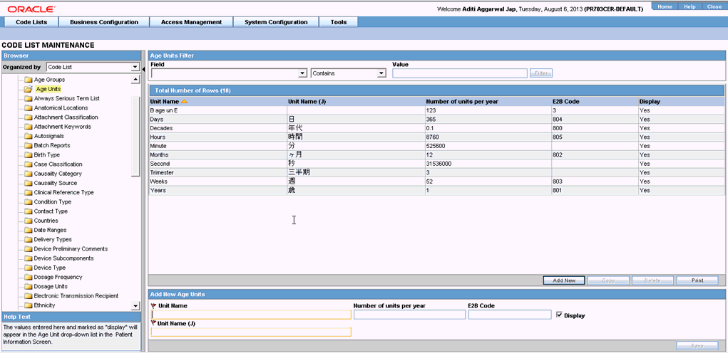 Click Add New and enter the E2B Code for the new age unit in the Add New Age Units section.