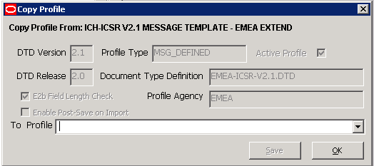 Note: The Copy Profile option can be used to create custom E2B profiles with customized Export / Import mapping logic for any E2B element. However, any new changes / fixes applied to factory E2B profiles are not automatically applied on the custom E2B profiles. Hence, the custom profile logic may get obsolete by any Argus Safety version upgrade which has changes / fixes applied to factory E2B profiles. In such a scenario, customers should re-create their custom E2B profile again, by copying the new factory E2B profile and applying their custom Export / Import mapping logic manually. |