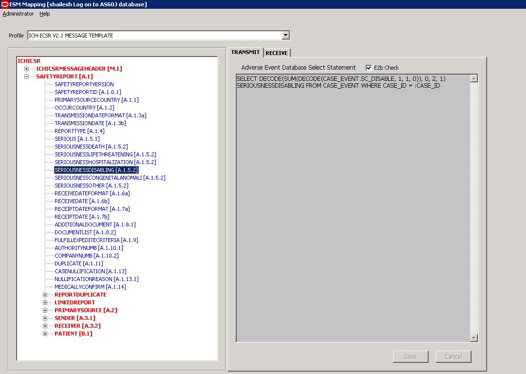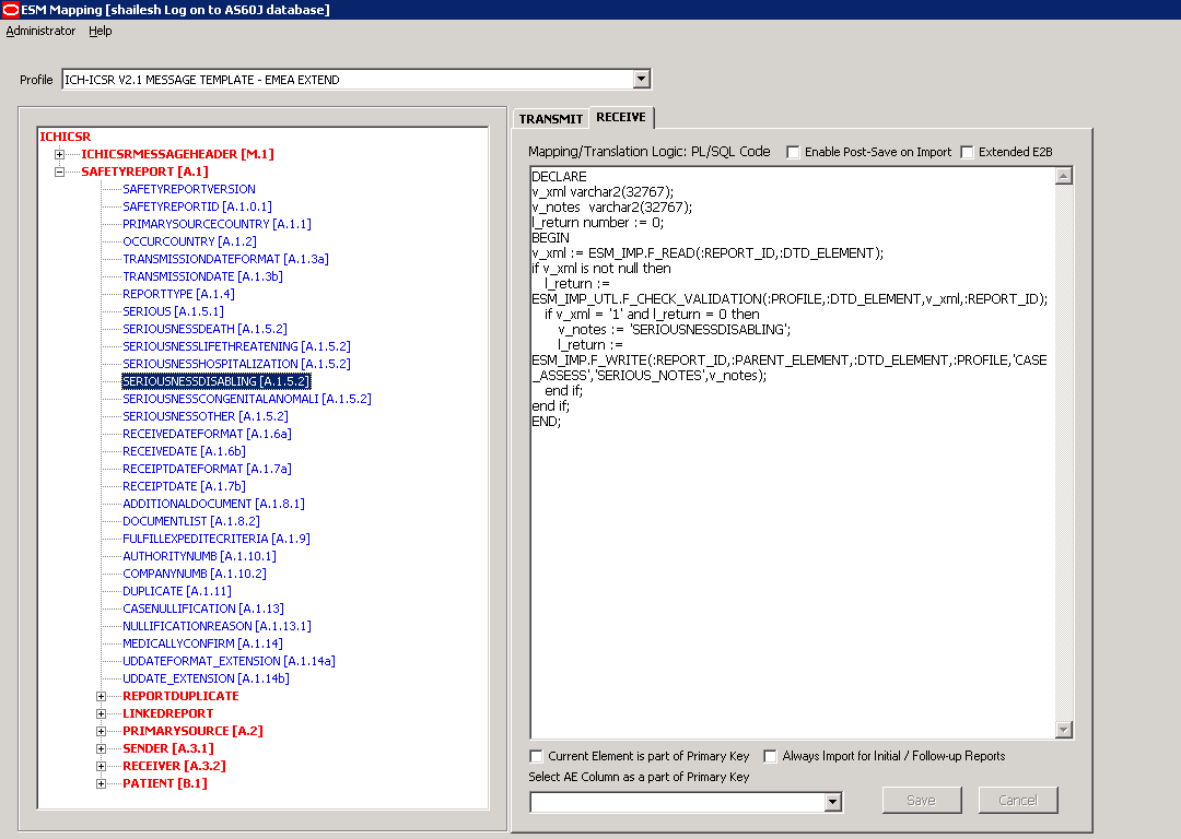 | Adverse Event Database Select Statement | Enables you to enter and view the SQL logic used to extract the value of the selected element of the DTD profile from AE database. |