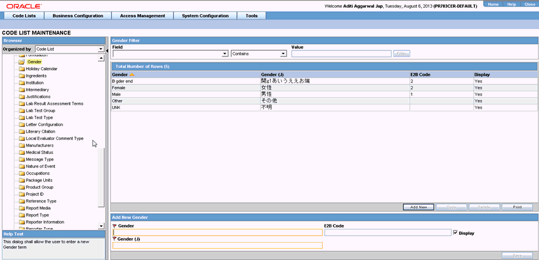 When the system opens the Code List Maintenance screen, click Gender in the Code List in the left pane.