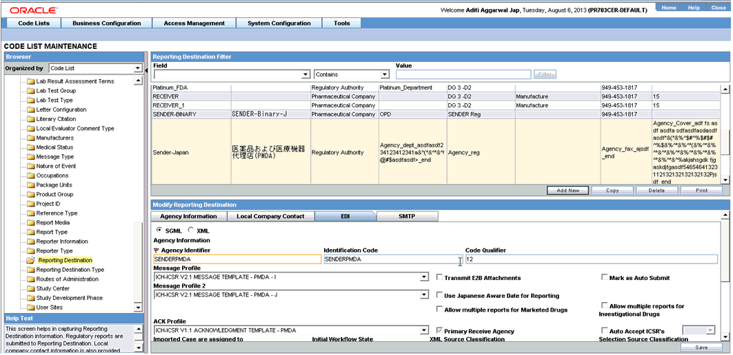 Note: To modify or create new Regulatory Authorities/Trading Partners, choose Reporting Destination in the Code List in Argus Console. |