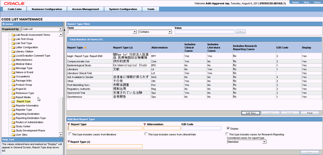 Enter the E2B code for the new report type in the Add New Report Type section.