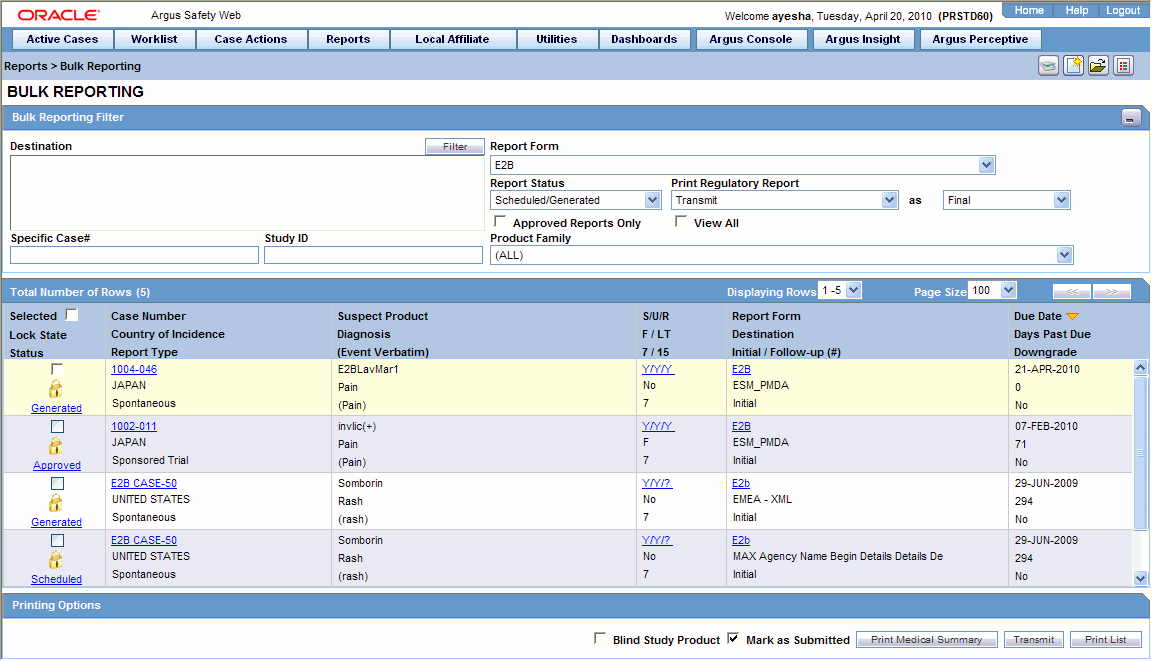Argus Safety enables you to simultaneously submit multiple adverse event reports to ease the submission process. This section describes how you can use the Bulk Reports by Case and the Bulk Reports by Form features to transmit E2B reports.