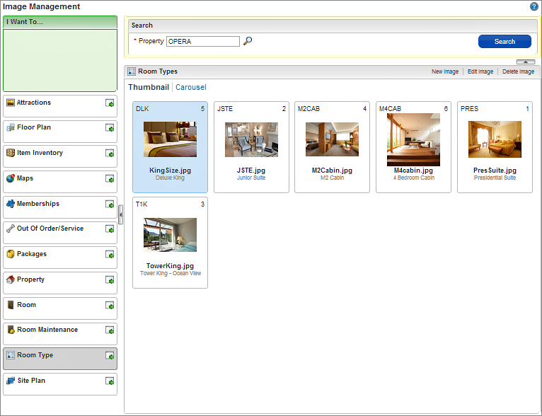 Upload your Property and Chain images to the Image Management Workspace, which is organized into categorized jumps to help you browse and manage your entire image collection all in one place. These are the images that appear throughout the application, such as pages in the Property Brochure, or from hyperlinks such as Room Type in the Look To Book availability.