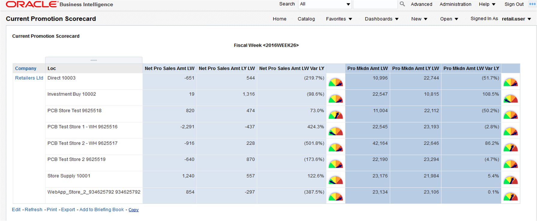 Reports such as Current Promotion Scorecard use gauges to represent the quality of KPI values. In the following example, profit and markdown variances are qualified with Oracle BI dial gauges, with an indicator that points to where the data falls within predefined limits.
