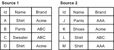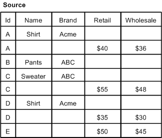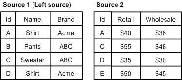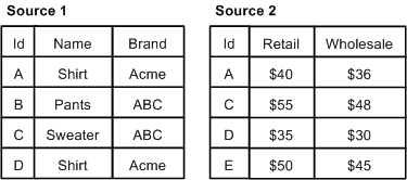 In the example below, Records A, C, and D have equivalents in both Source 1 and Source 2. These records are combined. Records B and E do not have equivalents but they are still processed. As a result, Record B does not have values for Retail and Wholesale because there is no Record B in Source 2. Correspondingly, Record E has no values for Name and Brand because there is no Record E in Source 1.