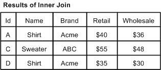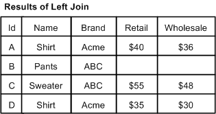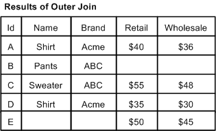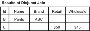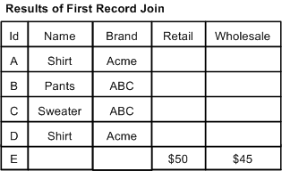 In this example, records B and E are unique across all sources, so they are processed. Records A, C, and D are not unique and therefore are discarded. Note that, in this example, the results for the join appear odd, because a record will never have both Name/Brand properties and Retail/Wholesale properties. Typically, this join is most useful when working with sources that share a common set of properties.