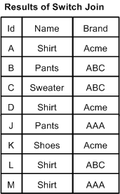 Note that records are never compared or combined, and all records from all sources are processed. Generally, a switch join is applied to sources that have similar properties but unique records, with respect to record keys, across the sources.