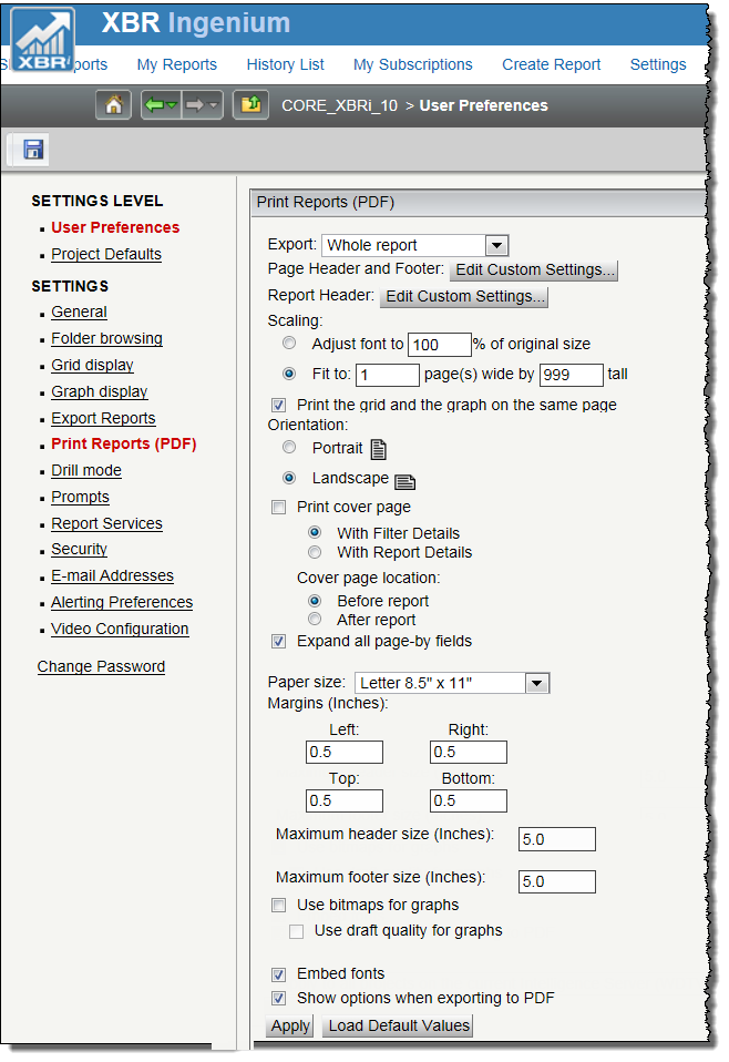 The Print Reports project defaults screen is only available if PDF printing is disabled. To disable PDF printing, clear the Use PDF for printing reports check box on the General preferences page. If PDF printing is enabled, the Print Reports (PDF) preferences page is displayed instead.
