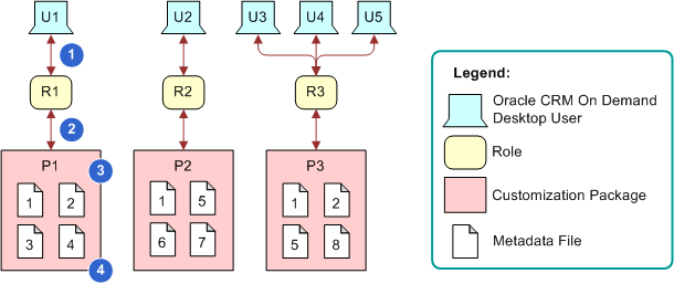Oracle CRM On Demand Desktop Administration Guide > How Oracle CRM On Demand Desktop Works > Metadata That Describes the Oracle CRM On Demand Desktop Application > Overview of Relationships Between Metadata ObjectsAn Oracle CRM On Demand Desktop user is associated with a given Oracle CRM On Demand Desktop configuration through a role that a customization package references. When the package is activated and published, a user who is associated with the role can download the configuration that is defined in the package. This configuration is a collection of metadata files that Oracle CRM On Demand Desktop stores on the Oracle CRM On Demand server and downloads to Microsoft Outlook during synchronization. Figure 2 illustrates the relationships between users, roles, customization packages, and metadata files. The following relationships exist between users, roles, customization packages, and metadata files: