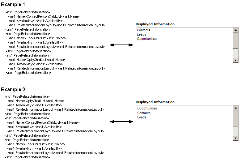 The order of the sections in the XML file for the Displayed Information section (that is, if Availability is set to 1) determines the order that is displayed in the UI. This order applies to both the ReadAll and Upsert commands. Figure 4 displays how the order is implemented. In Figure 4, in Example 1, the sections have the following order: Contacts, Leads, and then Opportunities. In Example 2, the sections have the following order: Opportunities, Contacts, and then Leads . Figure 4. About the Displayed Information Section