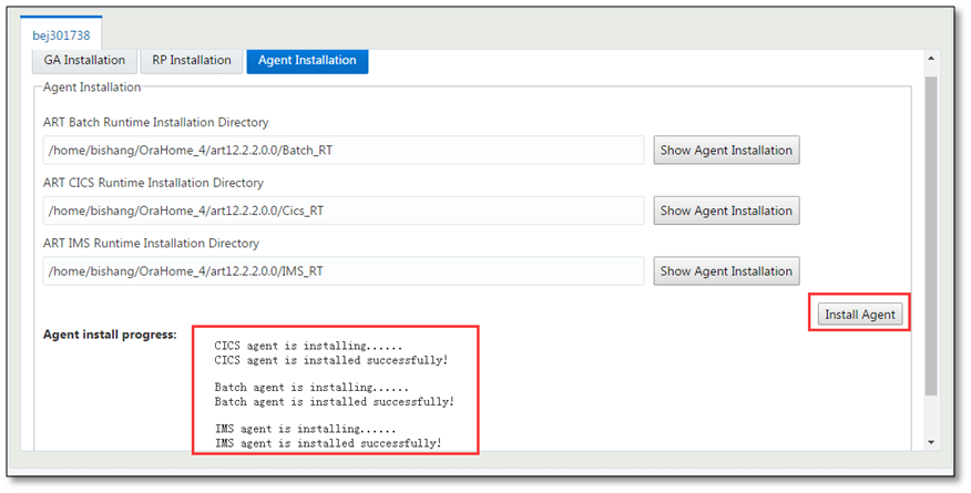 After installing the agents, when starting relevant Tuxedo domains, the console window shows all Tuxedo servers being started. Check to make sure that the servers containing ART Test Manager’s agents start normally. These servers in CICS, IMS, and Batch domains are called ARTCICSAGENT, ARTIMSAGENT, and ARTJESAGENT respectively.