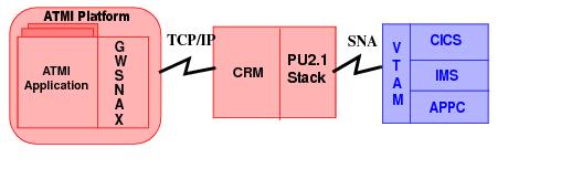 Oracle Tuxedo Mainframe Adapter for SNA allows Application-to-Transaction Monitor Interface (ATMI) applications to communicate with the mainframe. The Oracle Tuxedo Mainframe Adapter products provides domain-compliant gateways that permit administration of the remote Transaction Processing (TP) system as a foreign domain.The ATMI application administrator enables remote domains to access a subset of Local Services. This subset is called a Local Domain. The local domain helps the administrator provide secure “views” of the application.Oracle Tuxedo Mainframe Adapter for SNA is composed of two major components that can be configured to provide SNA solutions, the Gateway and the Communications Resource Manager (CRM). These components provide a bidirectional link enabling ATMI platforms such as Oracle Tuxedo to interact with mainframe applications as either a client or server, using a CICS/ESA and IMS implicit LU6.2, or any IBM-supported Application Program-to-Program Communication (APPC) or CICS/ESA interface. Figure 1‑1 illustrates the Oracle Tuxedo Mainframe Adapter for SNA architecture.Generally, the Oracle Tuxedo Mainframe Adapter for SNA domain is like other ATMI domain gateways. It uses the DMADM and GWADM servers for administration. Within the Oracle Tuxedo Mainframe Adapter for SNA system, additional servers and processes support peer CICS/ESA and IMS connectivity and sync level 2.