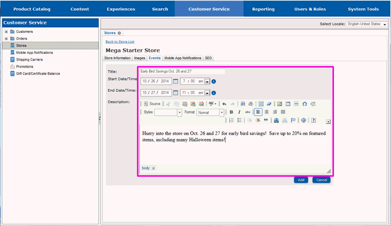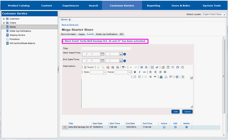 To complete these steps, you will need to be in the Customer Service -> Stores portion of the Site Manager. If you are unsure where that section is, see Work with a Store.