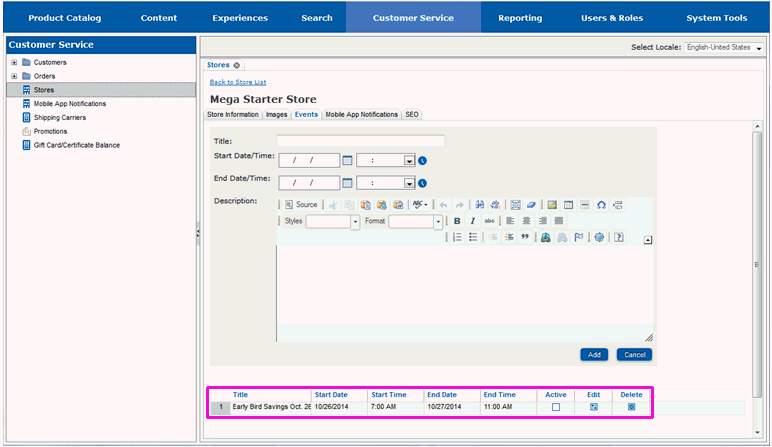 The page will redraw and you will see fields to define events for the store, along with a list of any events currently defined for the store.