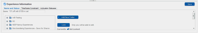 Experience tabs display across the top of the upper work area. Each opened experience will show in its own tab. Close a tab by clicking on the gray X icon in the top right of the tab.