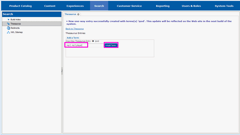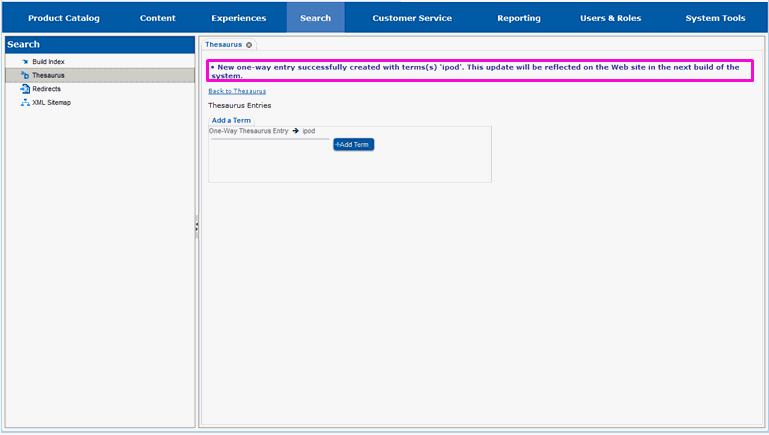 After Create Entry is selected, the page will refresh and you will see a message saying the synonym has been added.