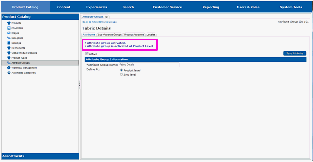 The page will refresh and you will see a message indicating the attribute group has been activated.