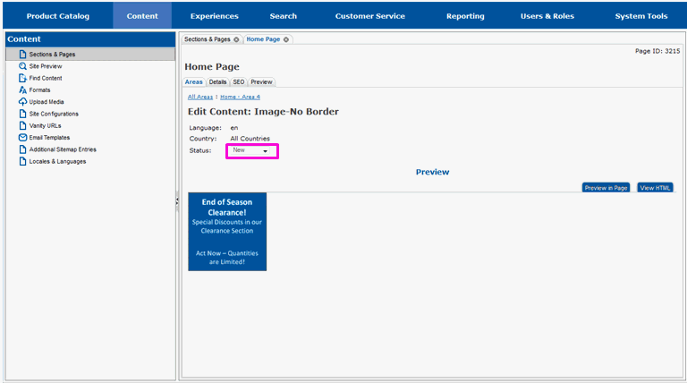 If you have changes you would like to make to the content, you can make those changes from the Areas tab for the specific page and area the content appears in. If you are not on the Areas tab, follow the steps in section Locate the Page and Area for New Content before proceeding with this step.