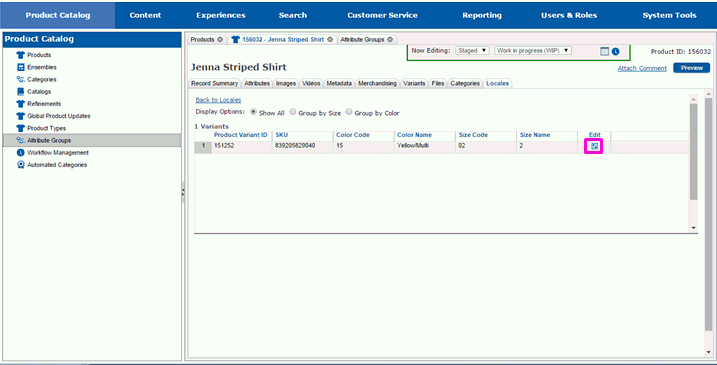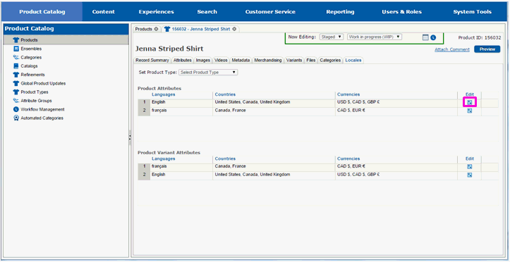 Select the Edit icon to the right of the locale in the Product Variant Attributes list that you wish to make modifications for.