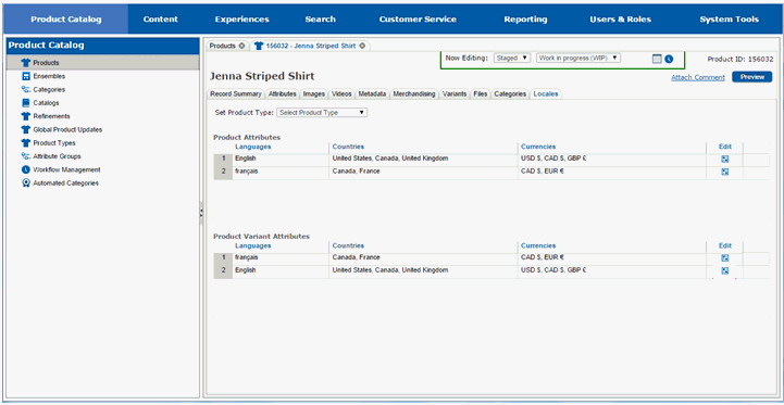There are three things that can be customized by locale for a product: product attributes, product variant attributes, and dynamic attributes. Customizations are done by determining the category of changes you want to make, and then selecting the locale(s) in the appropriate list for the category. We will first make product attribute changes.