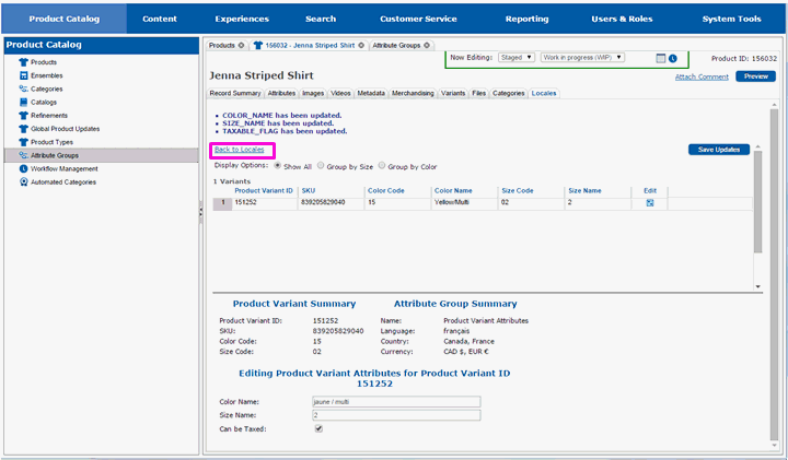 The page will redraw and you will be returned to the main Locales tab. Repeat editing the product variant attributes for each locale that you want to make customizations for.