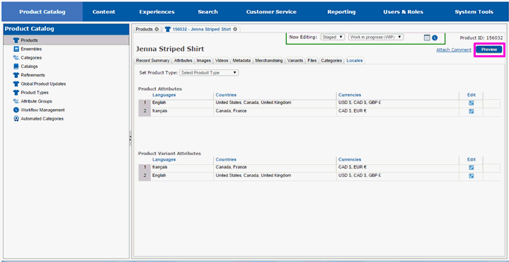 You may preview the product at any time while you are entering information for it. The preview shows you what the product's page on the website will look like, given the information that is currently defined for it. Although the sample image shows the current tab page as the Locales tab, you can preview the page while you are on any of the tab pages.