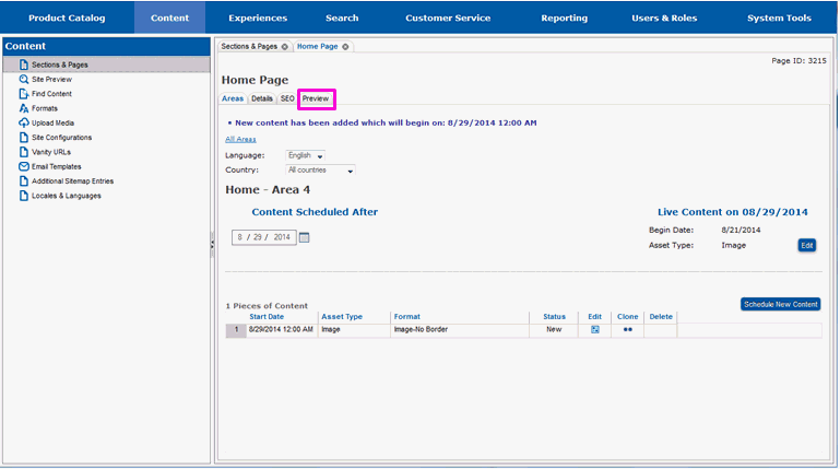 New content is previewed from the Preview tab for the page the content appears on. If you do not have the page opened and ready for editing, follow the steps in section Locate the Page and Area for New Content before proceeding with this step.