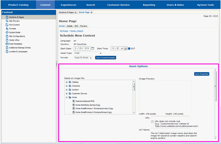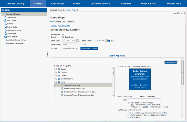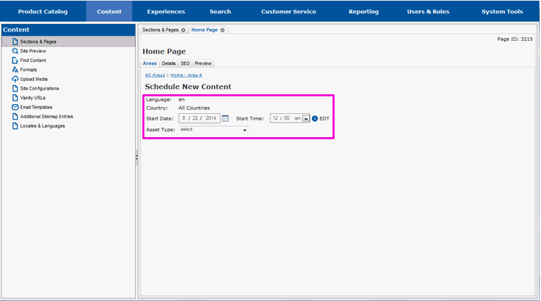 New content is scheduled from the Areas tab for the specific area on the page you want the content to appear on. If you are not currently on this tab in Site Manager, follow the steps in section Locate the Page and Area for New Content before proceeding with this section.