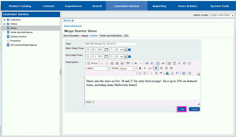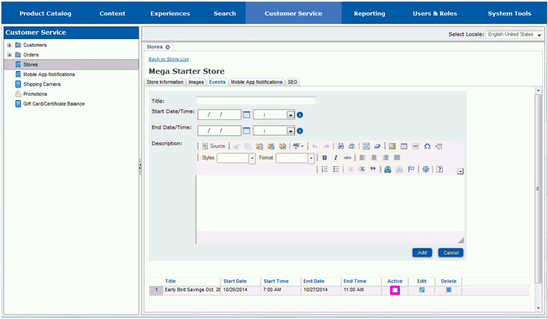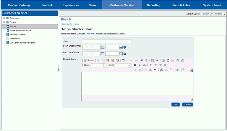 To complete these steps, you will need to be in the Customer Service -> Stores portion of the Site Manager. If you are unsure where that section is, see Work with a Store.