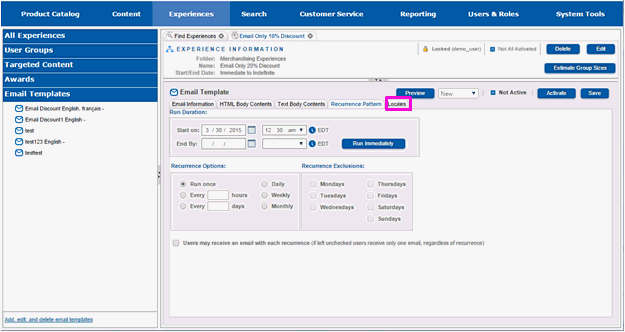 If your site is an international site, you will see a "Locales" tab where you can set the locales the email template is valid for.