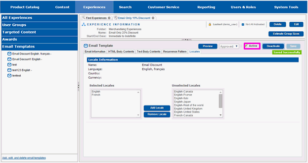 Select a locale in the Selected Locales text box, then select Remove Locale to invalidate the email template in that locale..