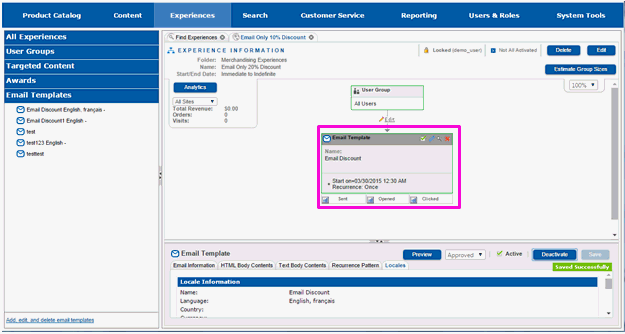 You will see that the outline for the email template box has turned green. This indicates that the email template was successfully modified and saved. The email is now considered active in the experience.