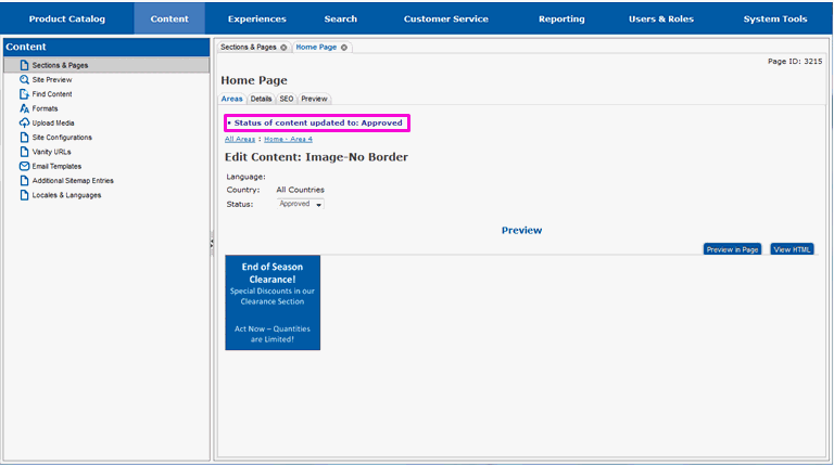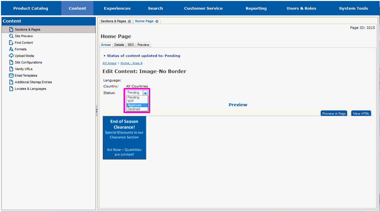 In order to approve or decline content, you must open the content for editing. If you are not currently on a page that shows the content and has a drop-down list for Status, follow the steps in Locate Content by Date or Status or Locate Content by Section and Page to locate and open the content for editing. Once the content is opened for editing, the steps to change the status are the same regardless of the method you used to locate the content. The example shown here assumes you located the content by following the steps in section Locate Content by Date or Status. If you followed the steps in section Locate Content by Section and Page, your screen may look slightly different.