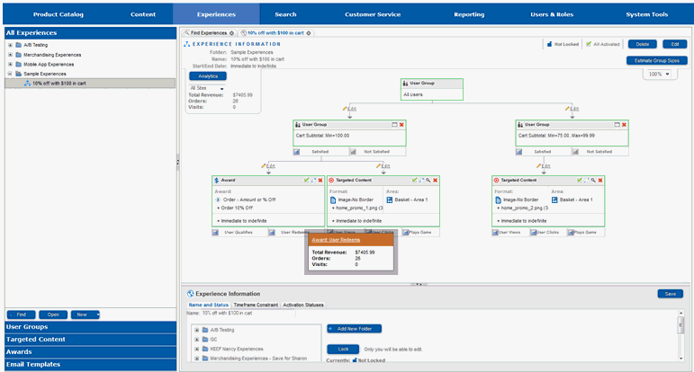The body of the page is where experiences are created. Selections from the sliding panes are dragged into this area and connected to other items that have been dragged in. A non-editable All users user group always displays in the body as a starting point for all experiences. Analytic information is displayed for each experience node when the mouse is hovered over the analytics icon ().