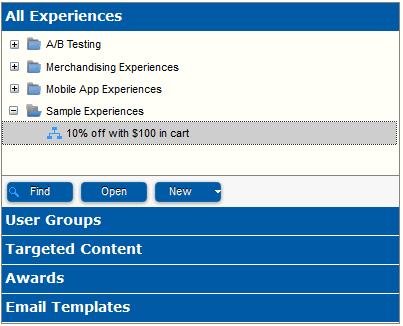 The stacked pane on the left of the screen is where the user makes selections of instances of components and drags them into the body. Existing experiences are opened from the “All Experiences” stacked pane. The display of the left stacked panes is privilege based and if you do not have privileges for a specific component, then the pane for that component will not display.