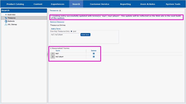 After Create Entry is selected, the page will refresh and you will see a message saying the synonym has been added.