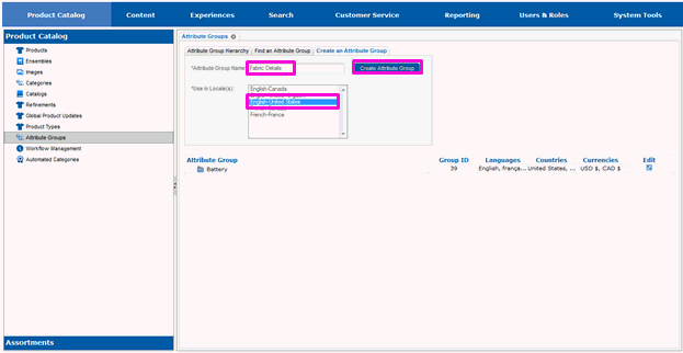 Attribute groups are created in the Product Catalog portion of the Site Manager.