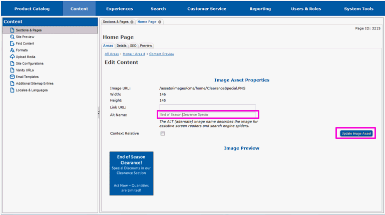 If you have changes you would like to make to the content, you can make those changes from the Areas tab for the specific page and area the content appears in. If you are not on the Areas tab, follow the steps in section Locate the Page and Area for New Content before proceeding with this step.