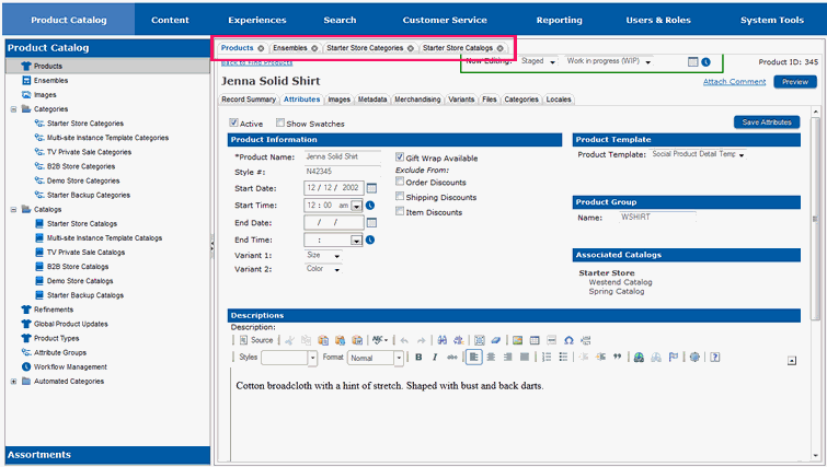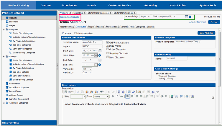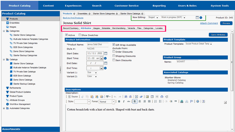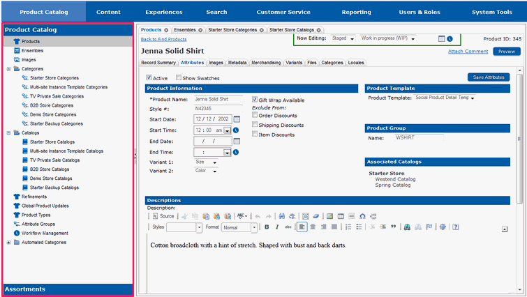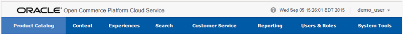The top header navigation area contains tabs for the different sections (i.e., Users and Roles, Content, Product Catalog, Search, Customer Service, Experiences, Reporting, and System Tools) as well as the main page of Site Manager.