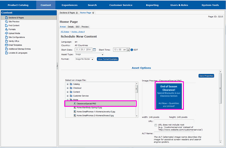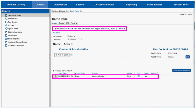 New content is scheduled from the Areas tab for the specific area on the page you want the content to appear on. If you are not currently on this tab in Site Manager, follow the steps in section Locate the Page and Area for New Content before proceeding with this section.