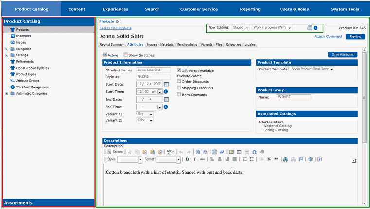 While the Site Manager Main Page is the first page you see, you will spend most of your time working within the different sections of the Site Manager. Although the functionality differs between sections, the interface for each section is the same (except for minor differences in the Experience Management section, which are described later). When working within a section, the page will be divided into two different areas: a pane on the left side that contains different areas of functionality that can be selected; and a pane on the right side that contains the work area for what is selected in the left pane. A header tab area will be present at all times and will allow you to move between the different sections within Site Manager.