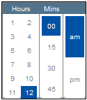 When clicked, the clock button opens a new pop-up layer over the existing page. This layer has a mini clock, in which you may choose hours, minutes, and AM or PM. To select the time, click the hour, minute, and AM or PM that you want to choose. The layer window will close when you click the mouse anywhere outside of the time text box.