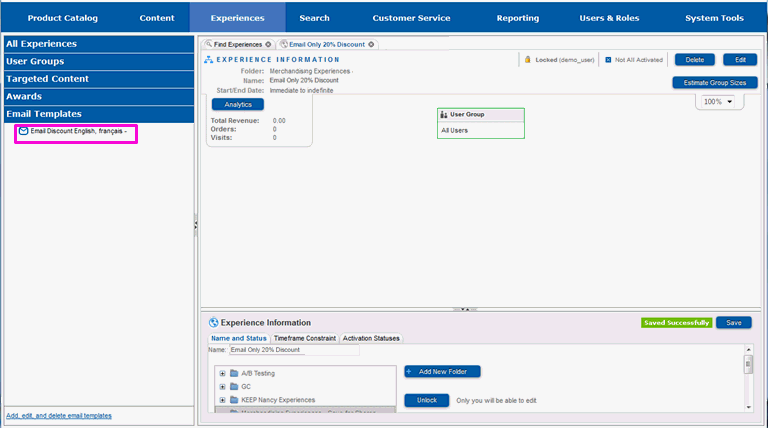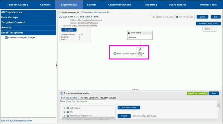 You will see that the outline for the email template box has turned green. This indicates that the email template was successfully modified and saved. The email is now considered active in the experience.
