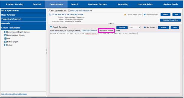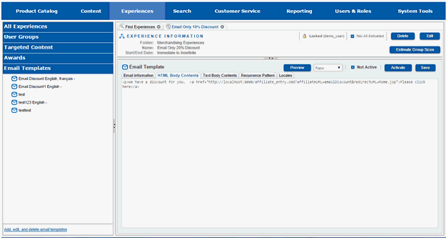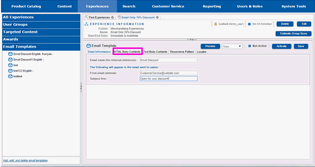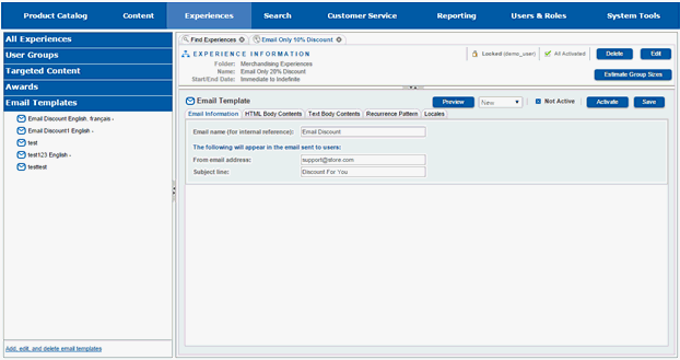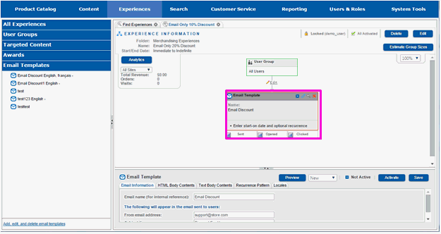 When experiences need the ability to send out emails, they do so through an email template. An email template is a starting point for the final email that is sent. Templates are meant to be customized after they are added to experiences.